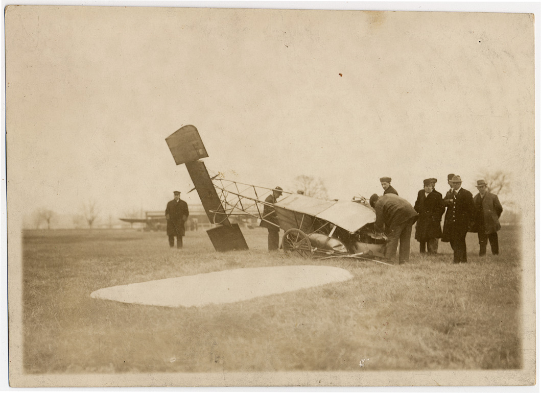 Crashed aerobatic airplane with crowd gathered. Handwritten on photograph back: "What an aeroplane wreck looks like. Result of an 80-foot fall by Roland Garras of the Moisant Aviators, from which he miraculously escaped unhurt. Flew at Michigan State Fair Grounds. c.1910."