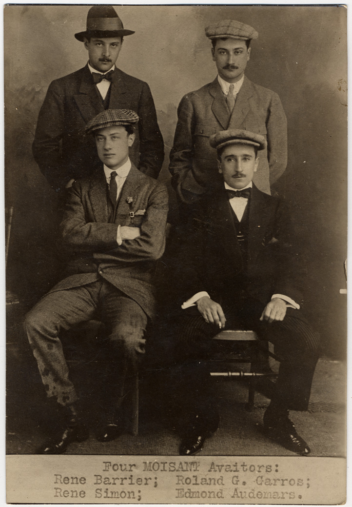 Four pilots in photographer's studio. Typed on photograph front: "Four Moisant avaitors[sic]: Rene Barrier; Roland G. Garros; Rene Simon; Edmond Audemars." Handwritten on photograph back: "Flew at Michigan State Fair Grounds, circa 1910." Newspaper article about Roland Garros' capture by Germans in 1915 attached to photograph.