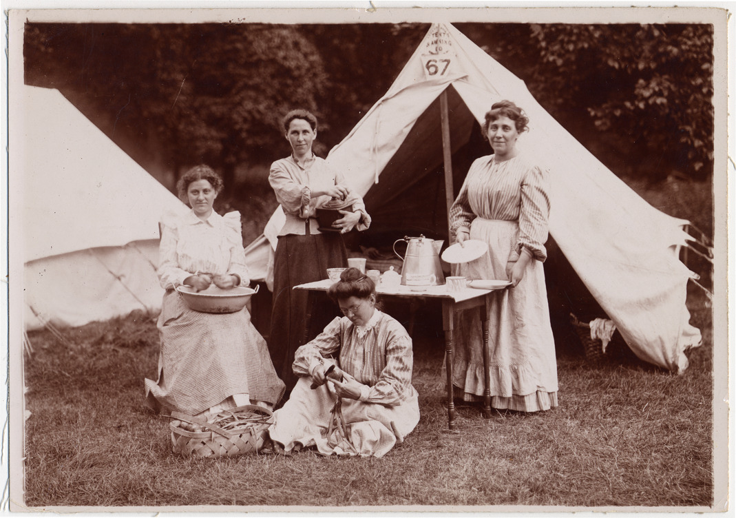 Favorite this☆ Four women in front of tent Description: Two women standing behind table set in front of tent, two sitting in front of table. Each is posed with a dish or tool; one is cutting an onion. Laundry basket inside tent flap. Details Resource ID: DPA0977 Subject: Camp sites, facilities, etc.--Michigan Outdoor cooking--Michigan Tents--Michigan Albumen prints Photographic prints Date Issued: Unknown year Format: 1 photographic print mounted on fabric ; image 5 x 7 in. Member of: Burton Historical Collection Filing Location: M/Camps Rights: Physical rights are retained by DPL. Copyright is retained in accordance with U.S. copyright laws.