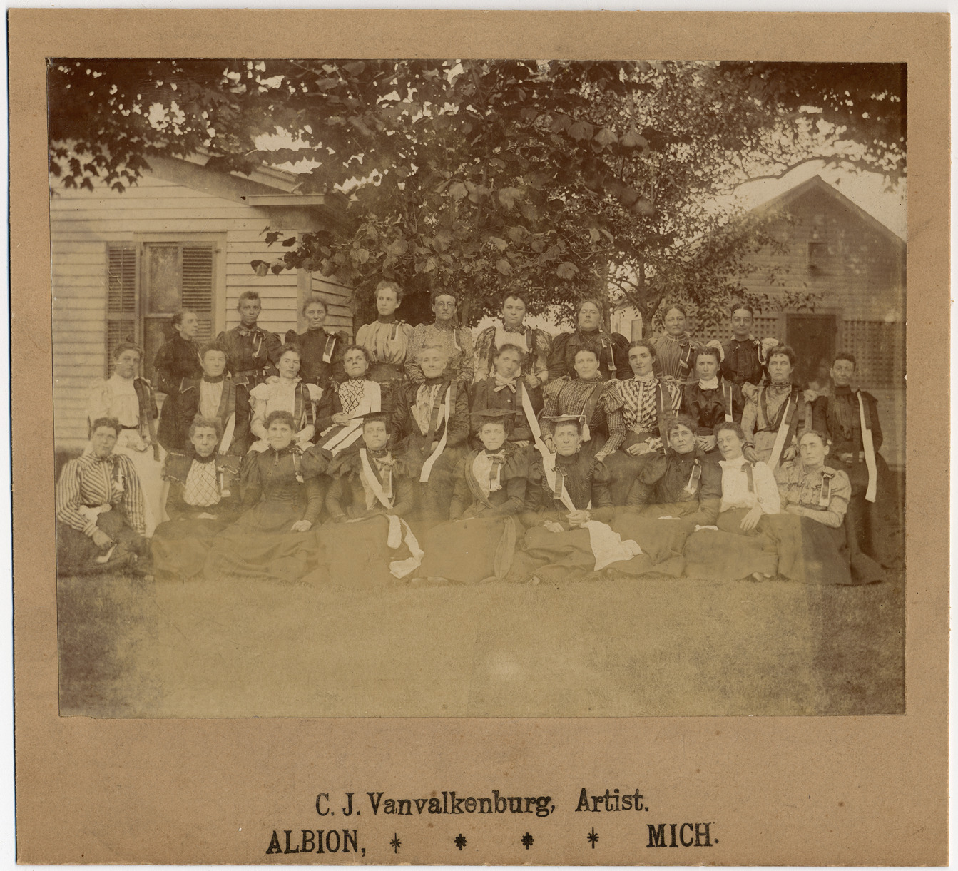 Group of women, not recent graduates, outside under trees with buildings behind. Many wear sashes or ribbons. Printed on mat front: "C.J. Vanvalkenburg, artist, Albion, Mich."