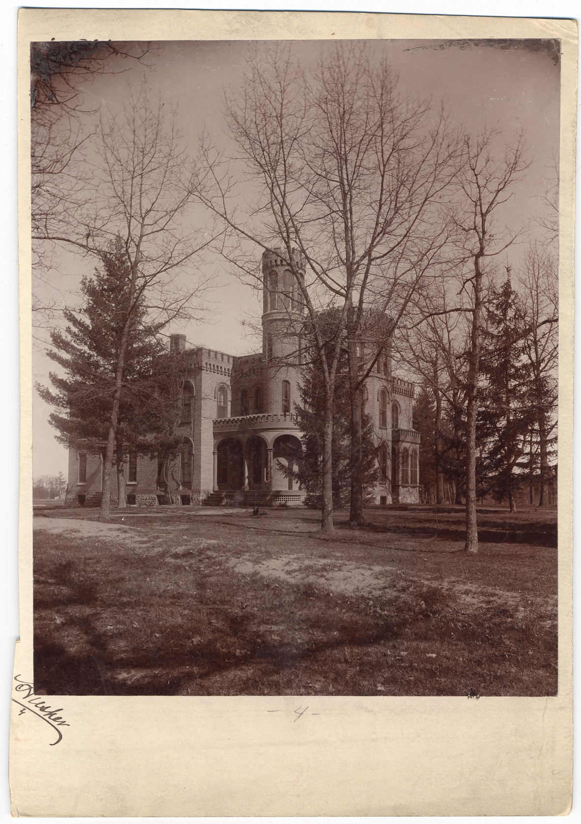 Building on the campus of the Michigan Military Academy in Orchard Lake, Michigan. The military prep school opened in 1877 and closed due to bankruptcy in 1908. Written on front of photo: "Husher." Written on photo back: "The castle at Orchard Lake Military Academy."