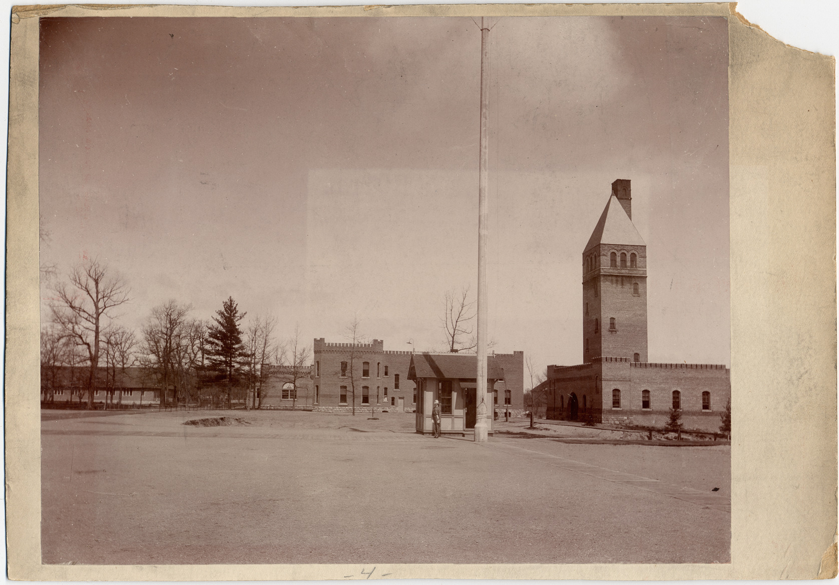 View of the campus of the Michigan Military Academy in Orchard Lake, Michigan. The military prep school opened in 1877 and closed due to bankruptcy in 1908. Written on the back of duplicate photo: "Michigan Military Academy from the south AD's office at flag pole with boiler house at right, 1882."
