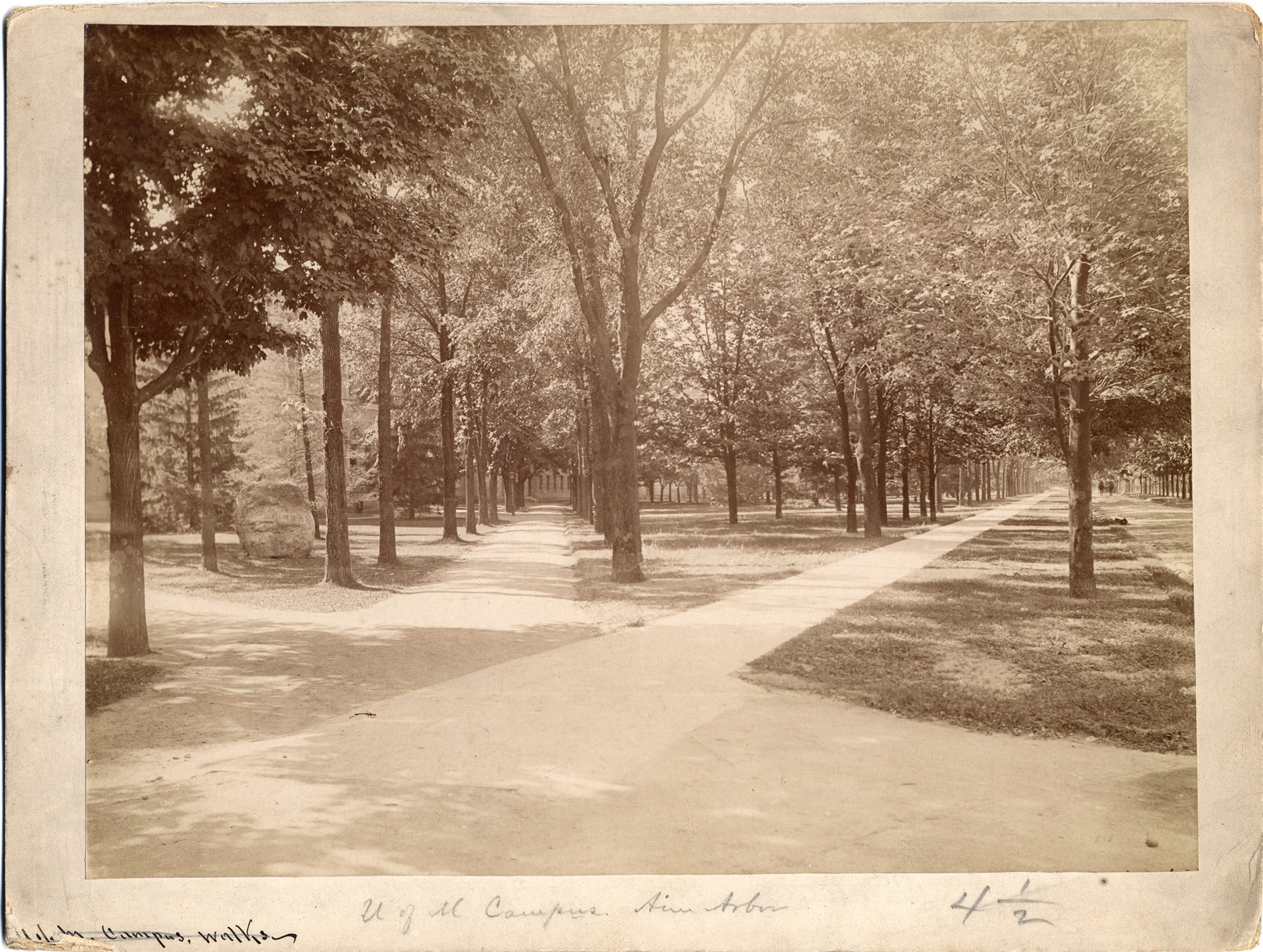 Favorite this☆ University of Michigan campus walks Description: Tree-lined paths through campus and along unpaved street. Large rock in middle distance. Handwritten on mat front: "U of M campus, Ann Arbor." Handwritten, and crossed out, on mat front: "U of M campus, walks." Details Resource ID: DPA1038 Subject: University of Michigan College campuses--Michigan--Ann Arbor Albumen prints Photographic prints Date Issued: Unknown year Format: 1 photographic print mounted on mat board ; image 7.5 x 9.5 in. Member of: Burton Historical Collection Filing Location: M/Colleges & universities Rights: Physical rights are retained by DPL. Copyright is retained in accordance with U.S. copyright laws.