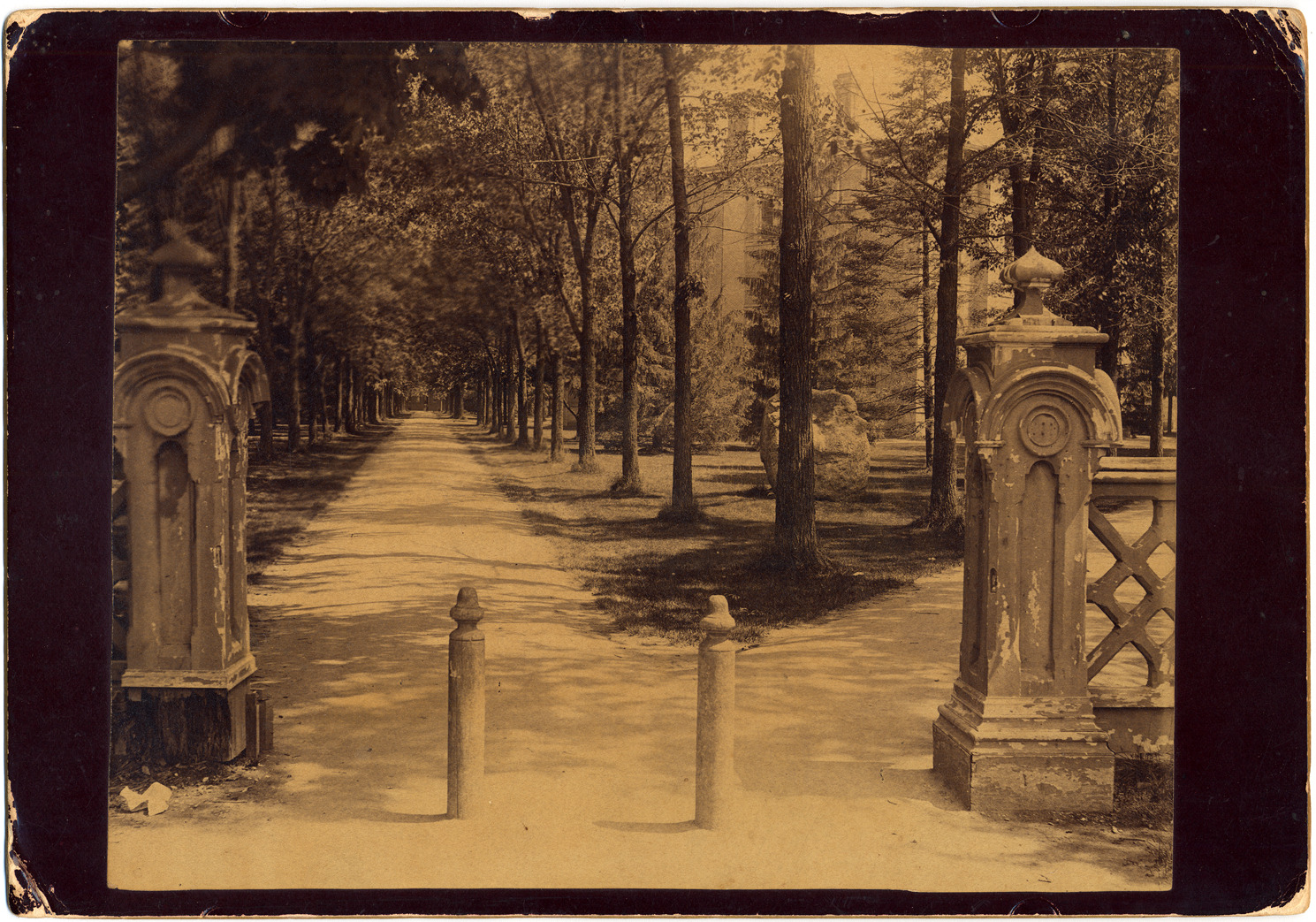 Paved paths through trees at the University of Michigan, with buildings in background. Printed on photo back: "A.L. Colton, photographer, Ann Arbor, Michigan, views of the State University a specialty." Written on photo back: "Diagonal walk U. of M. campus, Sept. 1-Aug 18, '77."
