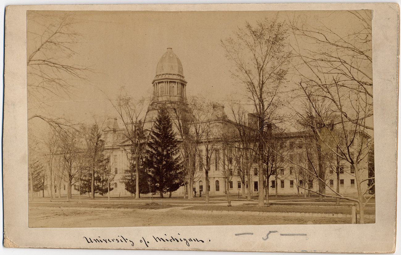 View of University Hall at the University of Michigan in Ann Arbor. Designed by E.S. Jenison and completed in 1873 this building connected Mason Hall and South College to form a grand centerpiece for the University of Michigan, it was razed in 1950. Written on front of photo: "University of Michigan."