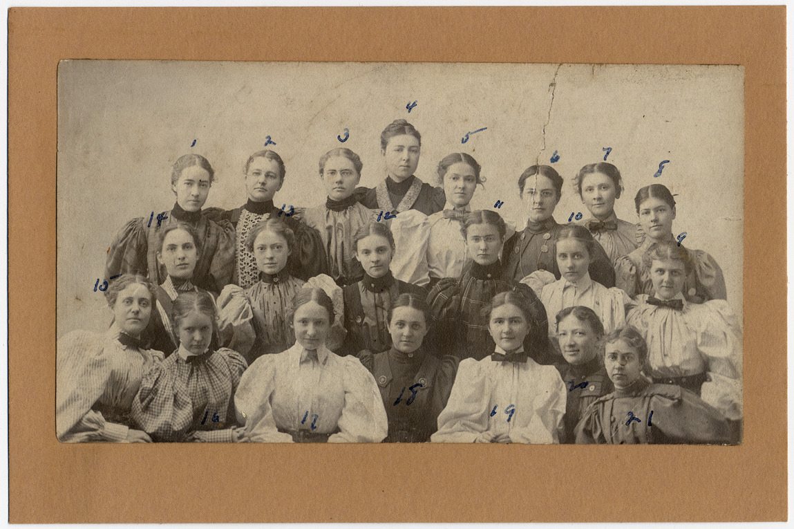 Unidentified student group. Each woman has a number handwritten to identify her using the key on the back. Handwritten key on mat back: "1. Harriet Taylor (Simmons), 2. Edna Holbrook, 3. Betsy Larrabee, 4. Grace Brinkey, 5. Helen Douglass (Bennet [crossed out]), 6. Georgina Mayford, 7. Frill Beckwith, 8. Grace Anderson, 9. Lillian Cole, 10. Eva Hill, 11. Esther Bealey, 12. Josephine Daniels, 13. Margaret Douglas - Bennet -, 14. Abigail Hubbard - Cooley -, 15. [?] Pelter, 16. Patty Bunker, 17. Kate Ballentine - Heavenrich -, 18. Mary Young, 19. Winifred Hubbel, 20. Emilie Flinterman, 21. Josephine Goodman."