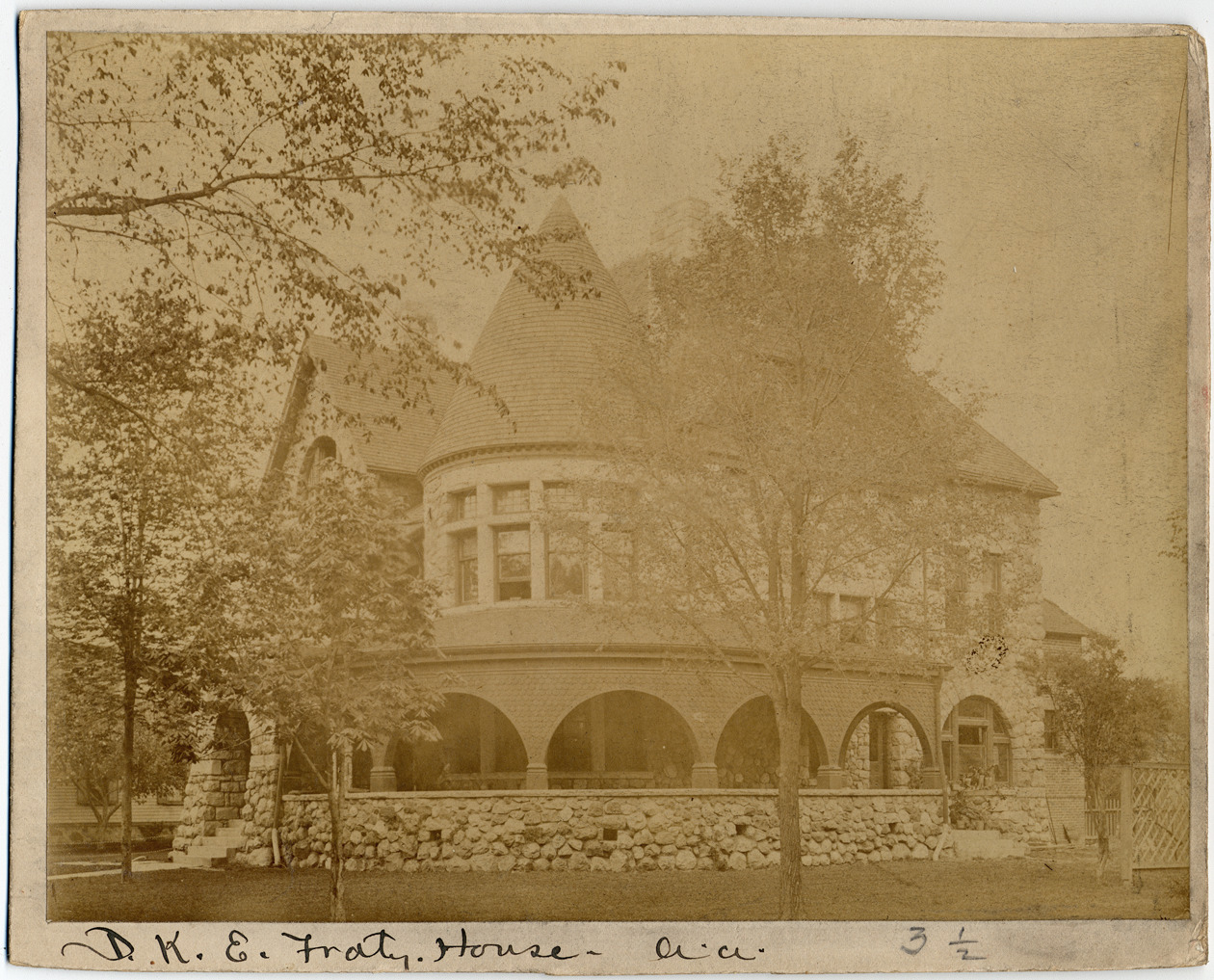 Favorite this☆ Delta Kappa Epsilon house at the University of Michigan Description: View of the Delta Kappa Epsilon house, a Queen Anne style fieldstone building at the University of Michigan in Ann Arbor. Written on front of photo: "D.K.E. frat house, A.A." Details Resource ID: DPA1101 Subject: Delta Kappa Epsilon. Omicron Chapter (University of Michigan) Architecture, Queen Anne--Michigan--Ann Arbor Albumen prints Photographic prints Date Issued: Unknown year Format: 1 photographic print mounted on mat board; image 6.25 x 8 in. Member of: Burton Historical Collection Filing Location: M/Colleges & univ.-U. of Mich. Rights: Physical rights are retained by DPL. Copyright is retained in accordance with U.S. copyright laws.