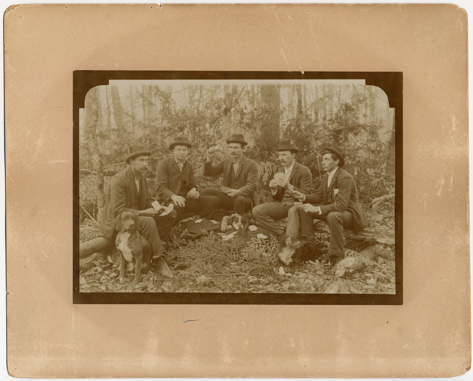 Favorite this☆ Card players in the woods Description: Five men in hats and suitcoats pose sitting on a log in a wooded area holding playing cards, with dogs sitting nearby. Details Resource ID: DPA1104 Subject: Card players--Michigan Dogs--Michigan Albumen prints Photographic prints Date Issued: Unknown year Format: 1 photographic print mounted on mat board ; image 5 x 7.25 in. Member of: Burton Historical Collection Filing Location: M/Costume-Men Rights: Physical rights are retained by DPL. Copyright is retained in accordance with U.S. copyright laws.
