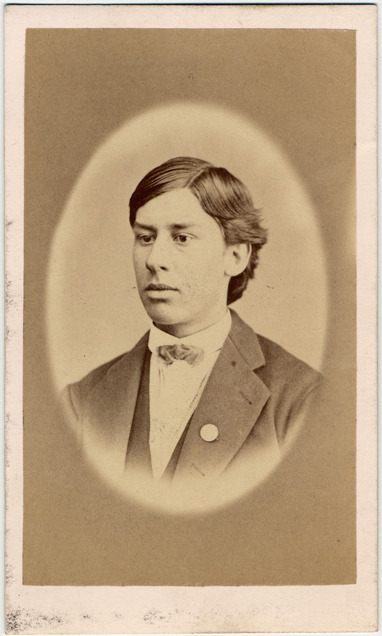 Portrait of a young man with side part, wearing suit coat, vest and turned down collar with small bow tie. Printed on photo back: "Philip Engelhart, photographer, Michigan Avenue, Lansing, Mich."