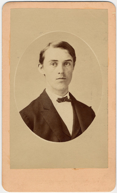 Portrait of a young man with side part, wearing suit coat, vest and turned down collar with small bow tie. Printed on photo back: "Watson & Co., East Huron St., Ann Arbor, Michigan, engraving copies, stereoscopic views, enter thro' store, ground floor studio."