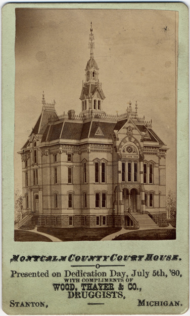 Favorite this☆ Montcalm County Courthouse Description: Souvenir card for dedication of courthouse. Printed on card front: "Montcalm County Court House, presented on dedication day, July 5th, '80, with compliments of Wood, Thayer & Co., druggists, Stanton, Michigan." Printed on card back: "Montcalm County Court House, Stanton, Michigan, corner stone laid Sept.10, '79. Dedicated July 5, '80. Watkins & Hidden, architects, Bay City, Mich., J.V. Consaul, builder, G'd Haven, Mich., Wm. F. Turner, W.D. Bellows, Wm. Backus, building committee. Wood, Thayer & Co., drugs & medicines, books, wall paper, legal blanks & stationery, 'Optimate' cigars. 112 East Main Street, Stanton, Mich. I.O. Chapman, photographer & printer, Stanton, Mich." Details Resource ID: DPA1128 Creator: Chapman, Issac O. Subject: Courthouses--Michigan--Montcalm County Photographers--Michigan--Montcalm County Carte de visite photographs Albumen prints Photographic prints Date Issued: 1880 Format: 1 carte de visite ; image 3.25 x 2.25 in. Member of: Burton Historical Collection Filing Location: M/Counties-Montcalm Rights: Physical rights are retained by DPL. Copyright is retained in accordance with U.S. copyright laws.