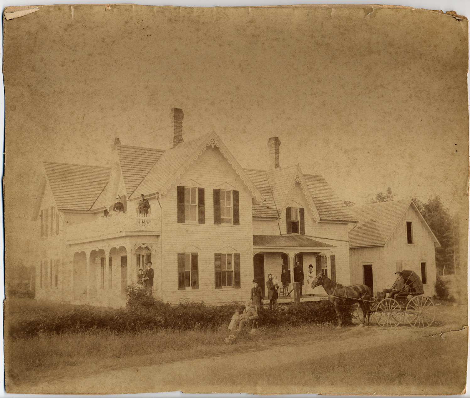 Favorite this☆ Farmhouse near North Branch Description: Large Victorian farmhouse with several porches, gingerbread trim. Groups of people on porches, in chair on grass, and in horse-drawn buggy. Handwritten on mat back: "Eli D. Richard, home sted[sic], North Branch, Rich Lee, Lapeer Co." Details Resource ID: DPA1138 Subject: Farmhouses--Michigan--North Branch Albumen prints Photographic prints Date Issued: Unknown year Format: 1 photographic print mounted on mat board ; image 8.25 x 10 in. Member of: Burton Historical Collection Filing Location: M/Farms Rights: Physical rights are retained by DPL. Copyright is retained in accordance with U.S. copyright laws.