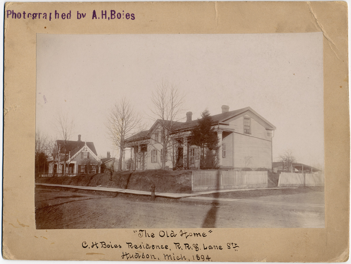 Clapboard house on rise viewed through leafless trees. Board sidewalk, road unpaved. Shed in back. Another house visible beyond, with gingerbread trim. Stamped on mat front: "Photographed by A.H. Boies." Handwritten on mat front: "'The Old Home,' C.H. Boies residence, R.R. & Lane Str., Hudson, Mich., 1894." Handwritten on mat back: "Old Boies house in Hudson, Mich."