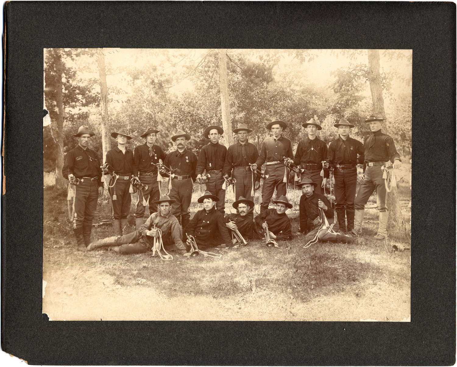 Buglers in grassy clearing. One line standing, one reclining in front; each holds a bugle. Handwritten on mat back: "(Henry Schaff, 309 Mullett St.), (C.D. 1907 Henry C. Schaff, 828 Jos. Campau)." Stamped on mat back: "S.B. Morrell, Photo Views Co., Detroit, Mich."