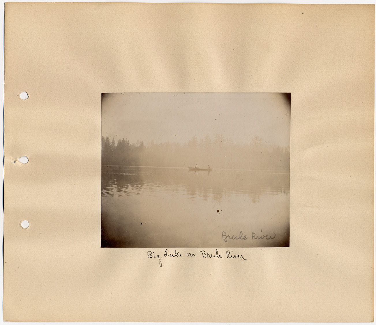 Favorite this☆ Boat in mist on Brule River Description: Two people in small boat in the mist. Evergreens on far bank. Photograph mounted on album page. Handwritten on photograph front: "Brule River." Handwritten on mat front: "Big Lake on Brule River." Details Resource ID: DPA1192 Subject: Brule River (Mich. and Wis.) Lakes--Michigan Boats and boating--Michigan Albumen prints Photographic prints Date Issued: Unknown year Format: 1 photographic print mounted on stock ; image 3.5 x 4.5 in. Member of: Burton Historical Collection Filing Location: M/Lakes Rights: Physical rights are retained by DPL. Copyright is retained in accordance with U.S. copyright laws.