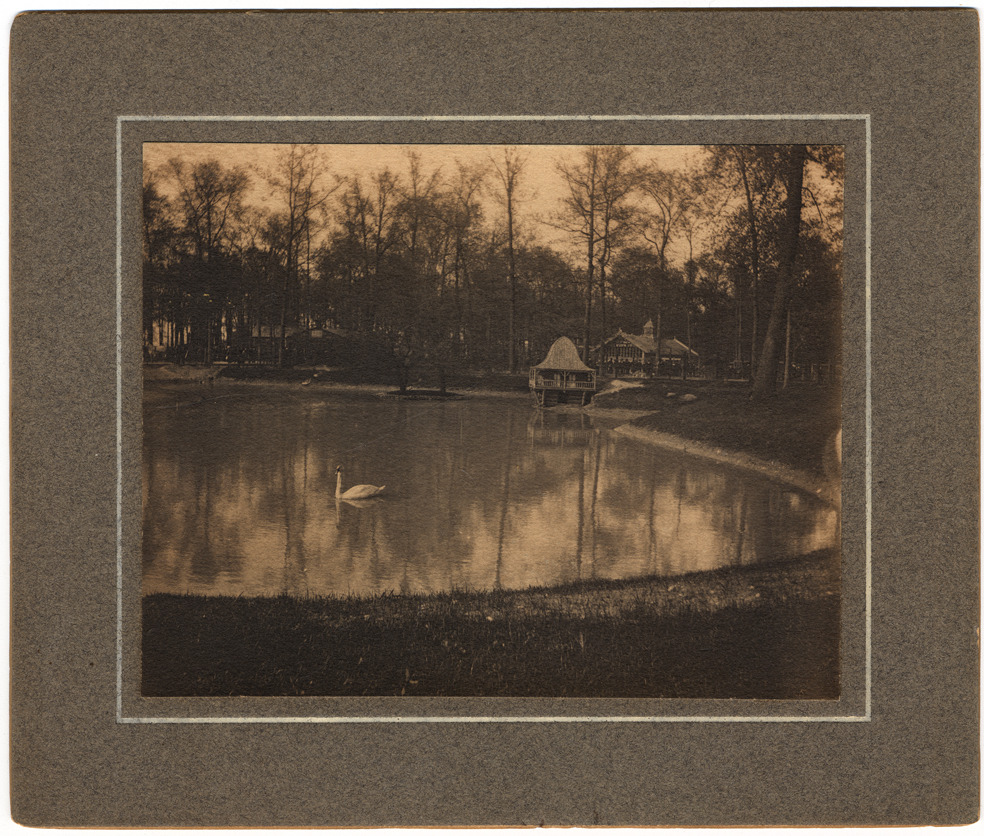 Artificial pond; swan on water. Pavilion on pilings over the water, with ornate building in the trees behind.