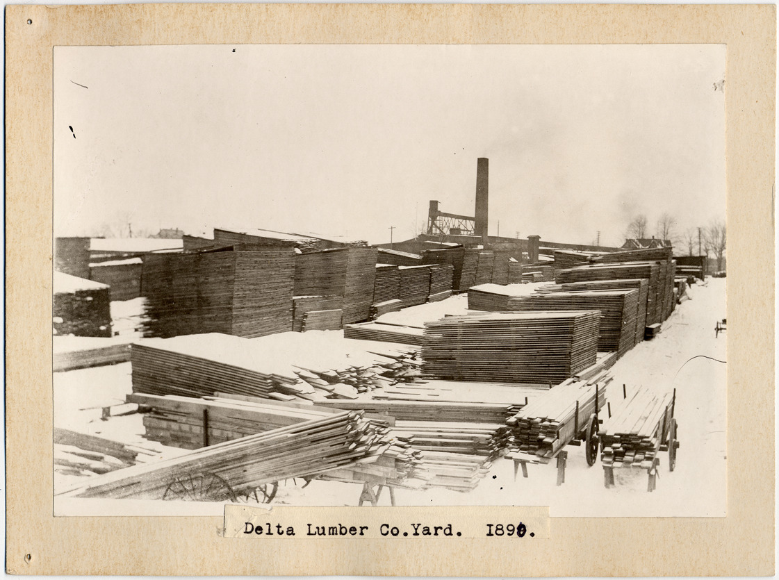 Favorite this☆ Delta Lumber Co. yard Description: Lumber yard in the snow. Carts holding lumber in foreground. Typed on label on mat front: "Delta Lumber Co. yard, 1890." Details Resource ID: DPA1212 Subject: Lumber trade--Michigan Lumber-yards--Michigan Albumen prints Photographic prints Date Issued: 1890 Format: 1 photographic print mounted on mat board ; image 4.5 x 6.5 in. Member of: Burton Historical Collection Filing Location: M/Lumber industry & trade Rights: Physical rights are retained by DPL. Copyright is retained in accordance with U.S. copyright laws.