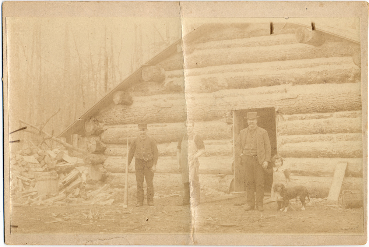 Favorite this☆ People in front of log cabin Description: Three men, small girl, and dog standing in front of log cabin doorway. Stack of firewood next to buildings. One man holds five-foot tapered horn. Details Resource ID: DPA1214 Subject: Log cabins--Michigan Lumber camps--Michigan Albumen prints Photographic prints Date Issued: Unknown year Format: 1 photographic print mounted on mat board ; image 4.75 x 7.75 in. Member of: Burton Historical Collection Filing Location: M/Lumber industry & trade Rights: Physical rights are retained by DPL. Copyright is retained in accordance with U.S. copyright laws.