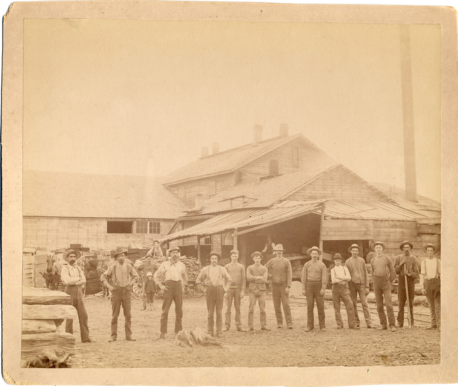 Favorite this☆ Sawmill workers in front of mill Description: Men standing in front of sawmill. One child back near horse-drawn wagons. Logs and sawn lumber. Stamped on mat back: "Chapman Bros., Stanton, Mich., photographers." Details Resource ID: DPA1226 Creator: Chapman Brothers Subject: Sawmills--Michigan--Montcalm County Sawmill workers--Michigan--Montcalm County Photographers--Michigan--Montcalm County Albumen prints Photographic prints Date Issued: Unknown year Format: 1 photographic print mounted on mat board ; image 7.75 x 9.5 in. Member of: Burton Historical Collection Filing Location: M/Lumber industry & trade Rights: Physical rights are retained by DPL. Copyright is retained in accordance with U.S. copyright laws.