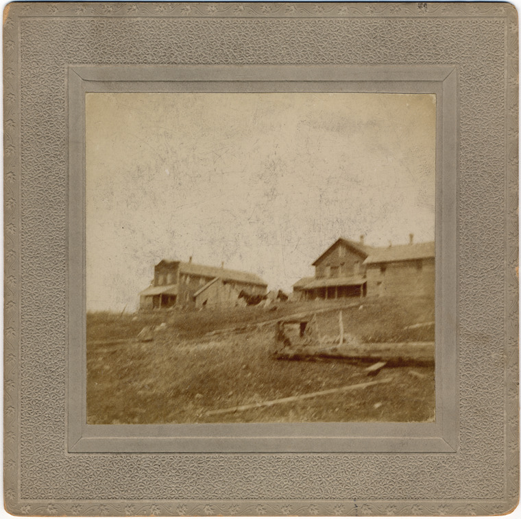 Wooden buildings on hill, one looks like storefront. Two horses between buildings. Log in foreground.