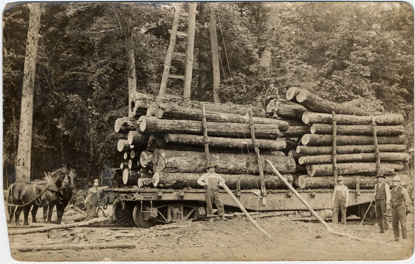 Favorite this☆ Cut timber loaded on flatcars Description: Railroad flatcar loaded with cut timber with workmen posed on and around car. Team of horses, crane, and standing trees in frame. Handwritten on card back: "Loading flat cars, from Geo. Young, 17450 St. Aubin St." Details Resource ID: DPA1250 Subject: Freight cars--Michigan Log transportation--Michigan Photographic prints Postcards Date Issued: Unknown year Format: 1 postcard ; 3.5 x 5.5 in Member of: Burton Historical Collection Filing Location: M/Lumber industry & trade Rights: Physical rights are retained by DPL. Copyright is retained in accordance with U.S. copyright laws.