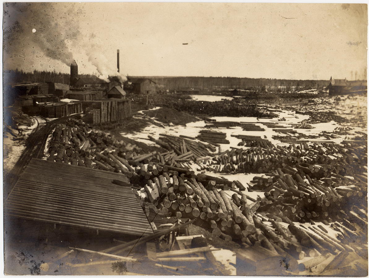 Timber storage yard with sawmill at end of railroad tracks in middle distance. Sawn lumber stacked by tracks. Buildings farther back among trees.
