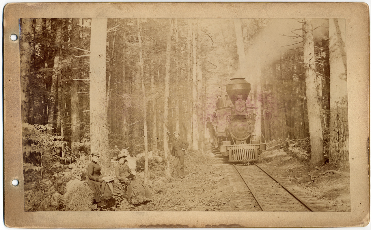 View of Mason & Oceana Railroad steam locomotive no. 1 on tracks through woods. Two women sitting and one man standing by track; engine crew posed on engine. The terminus of the Mason & Oceana Railroad was in Ludington, Michigan. Holes drilled in card and photograph to fasten into book. Printed on back: "E.S. Conrad, landscape artist, Reed City, Mich." Handwritten on back: "Butters & Peters at Ludington."