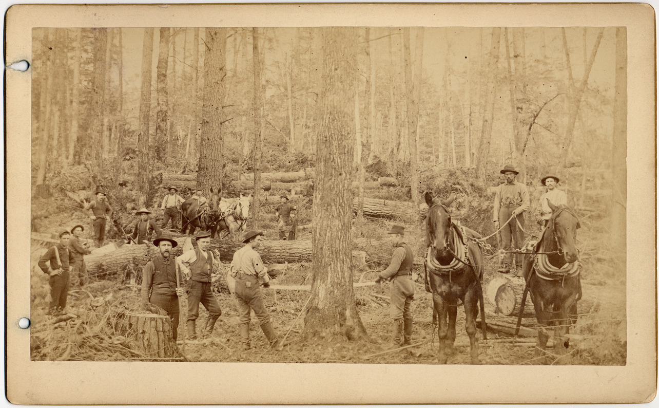 Favorite this☆ Logging crew Description: Logging crew posed with standing and cut trees. Two horse teams. Holes drilled in card and photograph to fasten into book. Printed on card back: "E.S. Conrad, landscape artist, Reed City, Mich." Details Resource ID: DPA1265 Creator: Conrad, E.S. Subject: Loggers--Michigan Logging--Michigan Cabinet photographs Photographers--Michigan--Reed City Albumen prints Photographic prints Date Issued: Unknown year Format: 1 cabinet card ; image 4.5 x 7.75 in. Member of: Burton Historical Collection Filing Location: M/Lumber industry & trade Rights: Physical rights are retained by DPL. Copyright is retained in accordance with U.S. copyright laws.