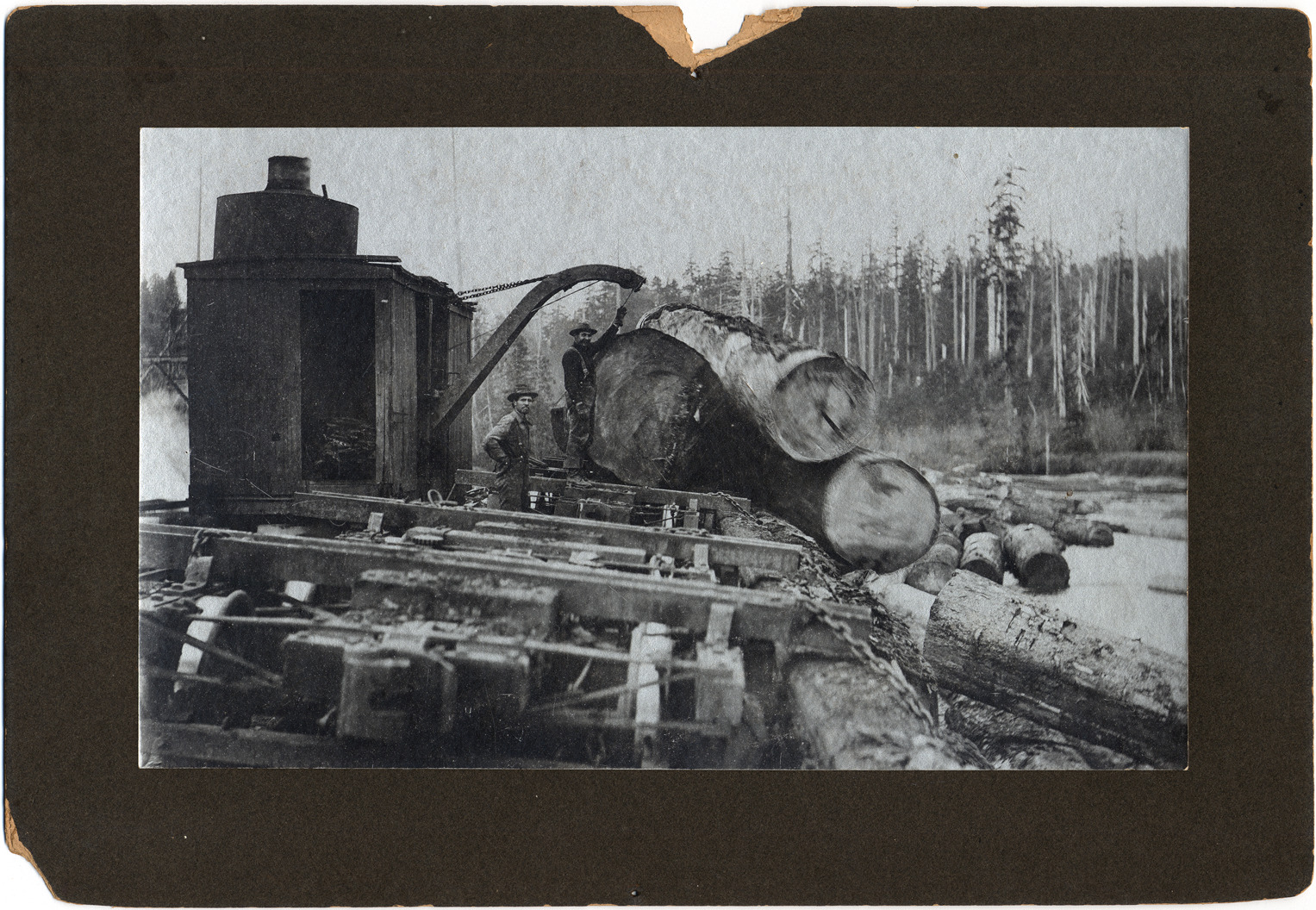 Favorite this☆ Pulling logs from river Description: Two men with machine and platform for pulling logs from river. Details Resource ID: DPA1279 Subject: Log transportation--Michigan Albumen prints Photographic prints Date Issued: Unknown year Format: 1 photographic print mounted on mat board ; image 5 x 8 in. Member of: Burton Historical Collection Filing Location: M/Lumber industry & trade Rights: Physical rights are retained by DPL. Copyright is retained in accordance with U.S. copyright laws.