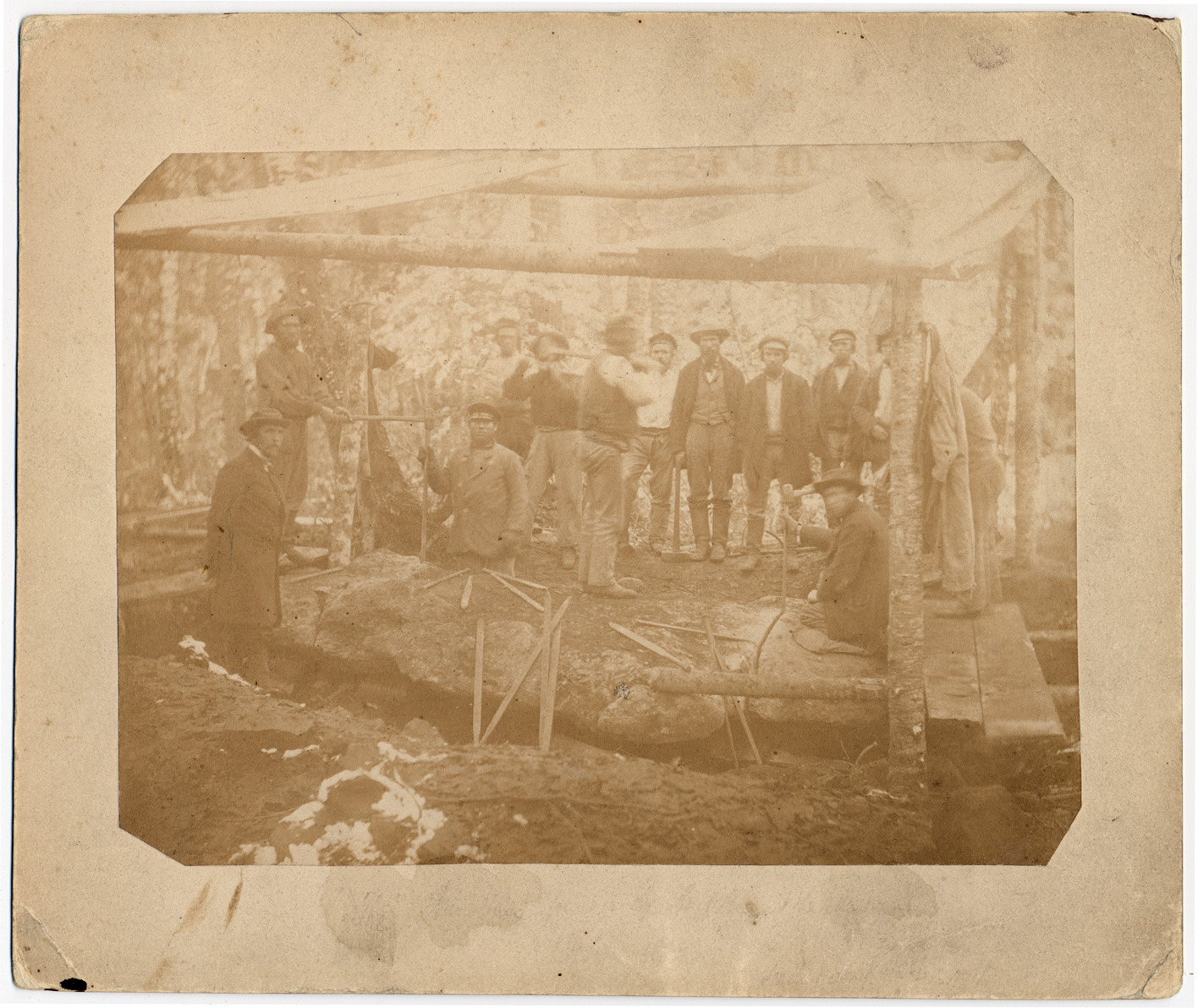 Massive chunk of copper, with work crew and formally-dressed man posing by it. Typed on mat back: "The 18-ton copper boulder shown on the other side was found at the Menard mine in Northern Michigan in 1862. It had been moved by ancient miners forty-eight feet from its original bed. See Mich. Pioneer and historical soc. 27, p.265. Presented by Dr. Anna Brockway Gray." Handwritten on mat back: "The Big Mass found on the surface at the Menard. Resulted about 18 tons ingot."
