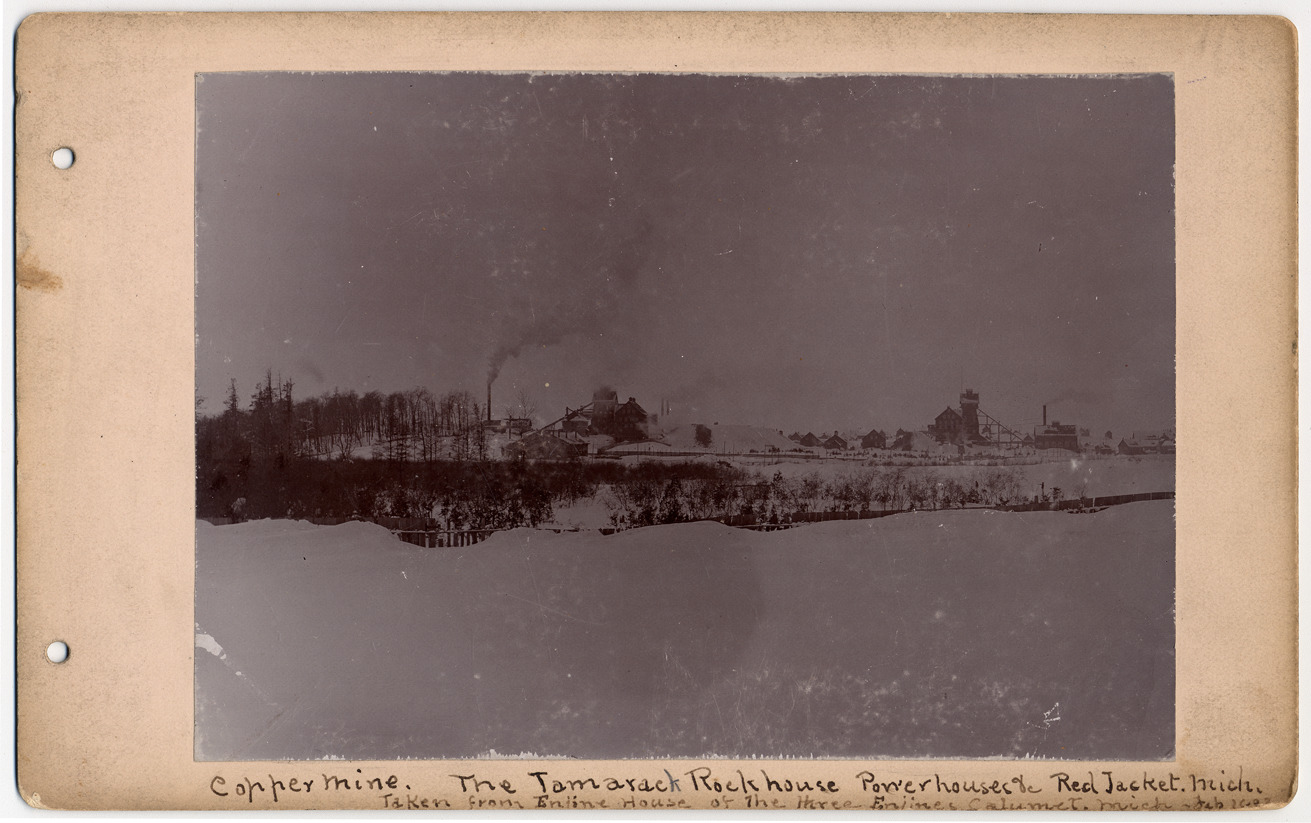 Distant view of mine buildings in the snow. Holes drilled in card to fasten into book. Handwritten on card front: "Copper mine. The Tamarack Rockhouse powerhouses at Red Jacket, Mich. Taken from enjine [sic] house of the three enjines [sic], Calumet, Mich."