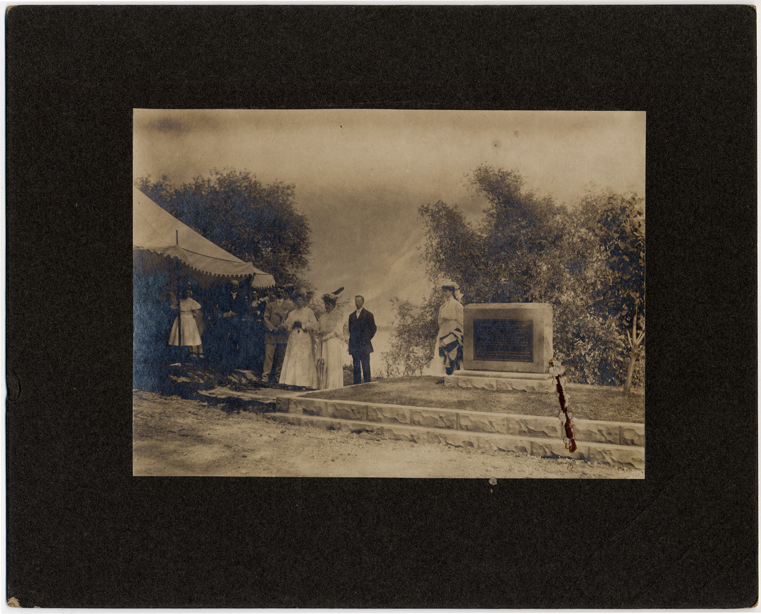 Group of people by river, between monument and canopy. Printed on monument: "This stone marks the location of the Treaty Tree and commemorates the conveyance by treaty of Grosse Ile (known to the Indians as Kitche-minishen) and adjacent islands to William and Alexander Macomb by the Pottawatomie indians. The treaty was signed by eighteen chiefs for the Pottawatomie nation of Indians on July 6, 1776. - The events of the past shape the pathway of the future. - Erected by the Women's Improvement Association of Grosse Ile, 1908."
