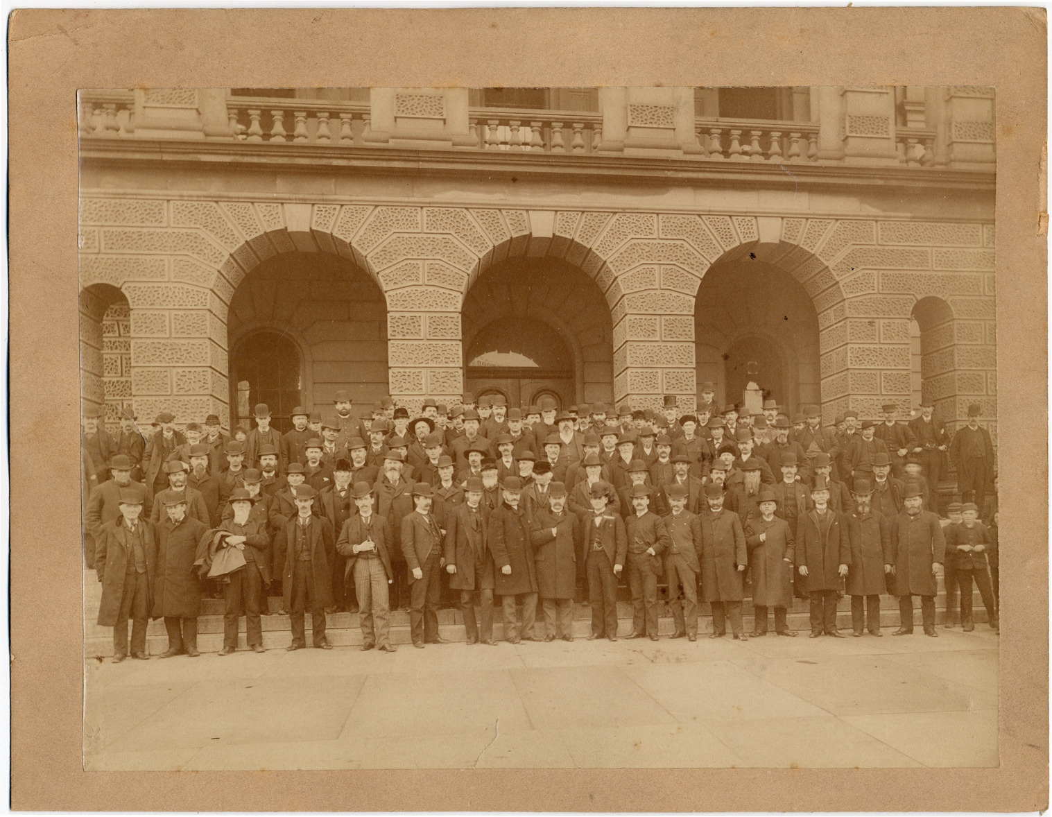 Large group of men, with some boys, posed on courthouse steps. Building is stone with arches leading onto porch.