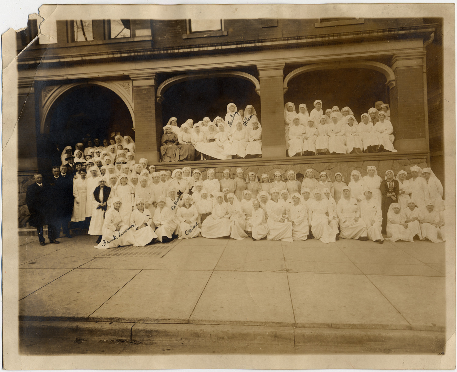 Red Cross nurses, in uniform, around porch at the Elks Temple. Four men in suits to the side. Handwritten names on photograph front: "Darling, Wilson, Lawrence, Frank Lawrence, De'Merrell, Caine." Handwritten on photograph back: "November 1918, Lansing, Michigan, Elks Temple. Headquarters for Red Cross work. Distributing of supplies. Chairman: Mrs. G.A. Caine. Committee: Mrs. Fred Lawrence, Mrs. Frank Lawrence, Mrs. De'Merrell, Mrs. Darling, Mrs. Wilson, Mr. Larrison."