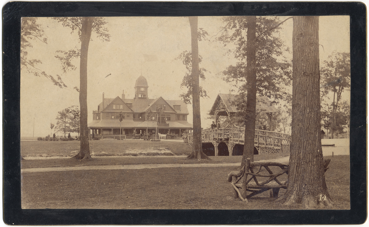 Rushmere Club, viewed across canal from park. Wooden frame building with cupola. Rustic bridge with pavilion across canal and rustic bench in foreground. Three men and one child under pavilion, two horse-drawn carriages by porch. Printed on photograph front: "14." Handwritten on mat back: "Rushmere Club on St. Clair River, near Port Huron, ca. 1880."