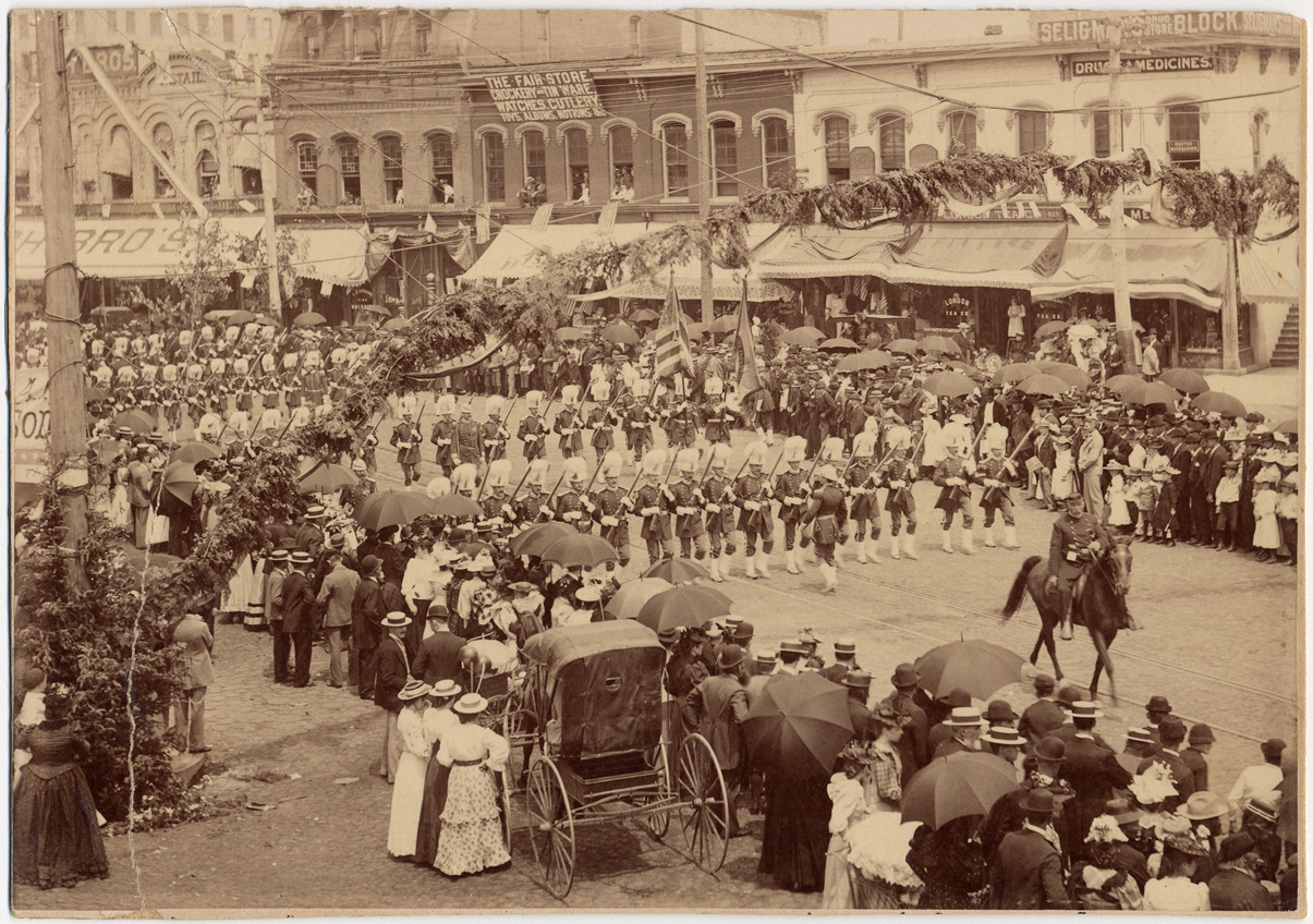 Military drill team led by officer on horse. Crowd lines both sides of street and appears in windows. Buggy in foreground. Bunting and evergreen branches in arch across street. Storefronts include: The Fair Store and London Tea Co. Handwritten on mat back: "E. Saginaw, July 4, 1893."