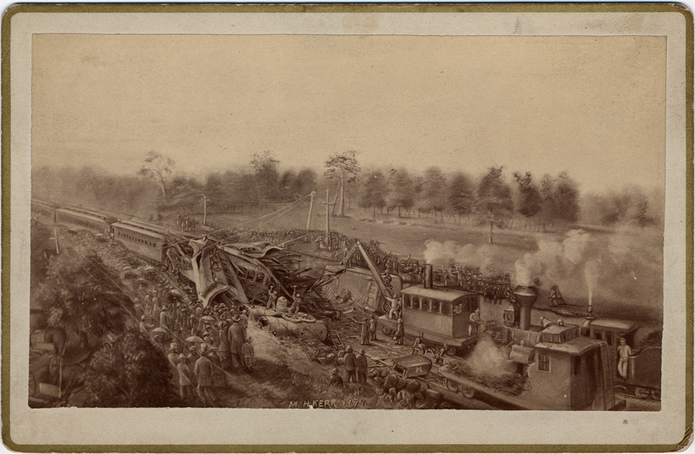 Drawing of clearing the railroad tracks after collision. Written on photograph front: "M.H. Kerr, 1879." Printed on card back: "Wreck of the collision between Pacific Express and freight train on M.C.R.R. near Jackson, Mich., October 10th, 1879. Fifteen passengers killed and twenty-nine wounded. From a drawing by M.H. Kerr, mute artist."