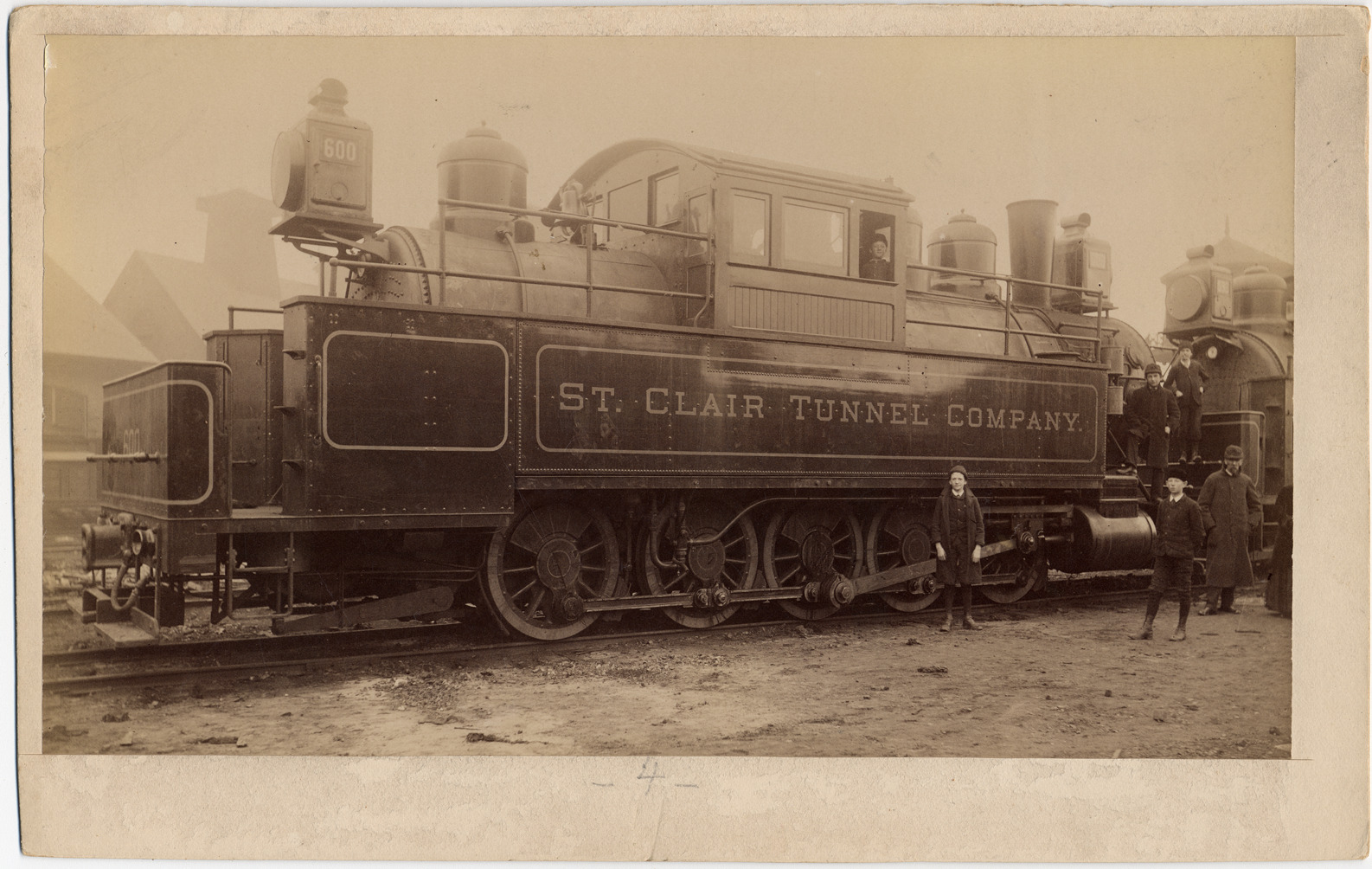 St. Clair Tunnel Company locomotive no. 600. Several boys and two adults, wearing winter clothing, on and next to engine.