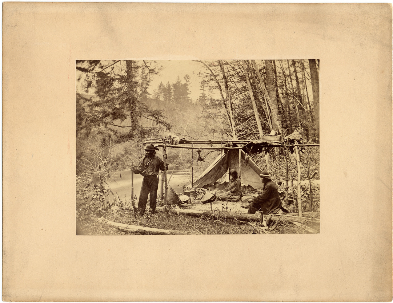 Favorite this☆ Indian camp along the Au Sable river Description: Three people in front of tent above the riverbank. One man standing, two people sitting. Meat on drying rack over fire. Handwritten on mat back: "Indian camp on Sable River, Mich." Details Resource ID: DPA1355 Creator: Stevenson, Frederick James, 1835-1926 Subject: Au Sable River (Mich.) Indians of North America--Michigan Camp sites, facilities, etc.--Michigan Photographers--England--London Albumen prints Photographic prints Date Issued: 1866 Format: 1 photographic print on mat board ; image 3.75 x 5.25 in. Member of: Burton Historical Collection Filing Location: M/Rivers-Au Sable Rights: Physical rights are retained by DPL. Copyright is retained in accordance with U.S. copyright laws.