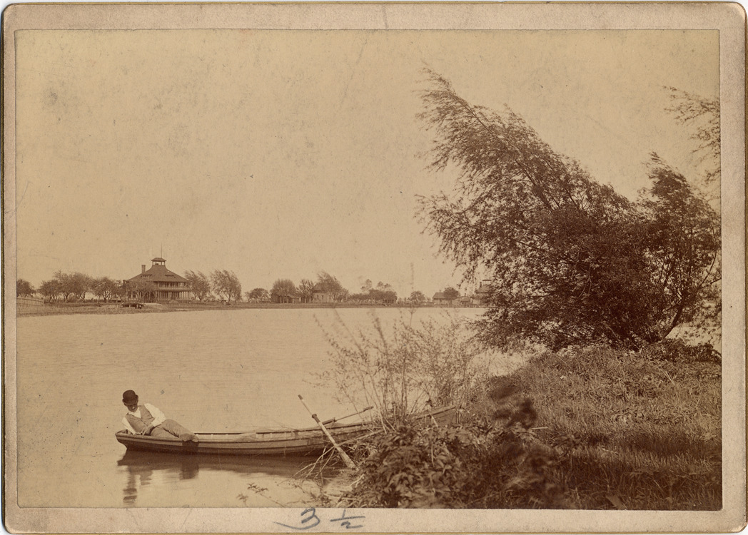 Man reclining in beached rowing boat on the river. Buildings on opposite shore, including large one with cupola and wrap-around porches. Handwritten on mat back: "On the River Raisin."
