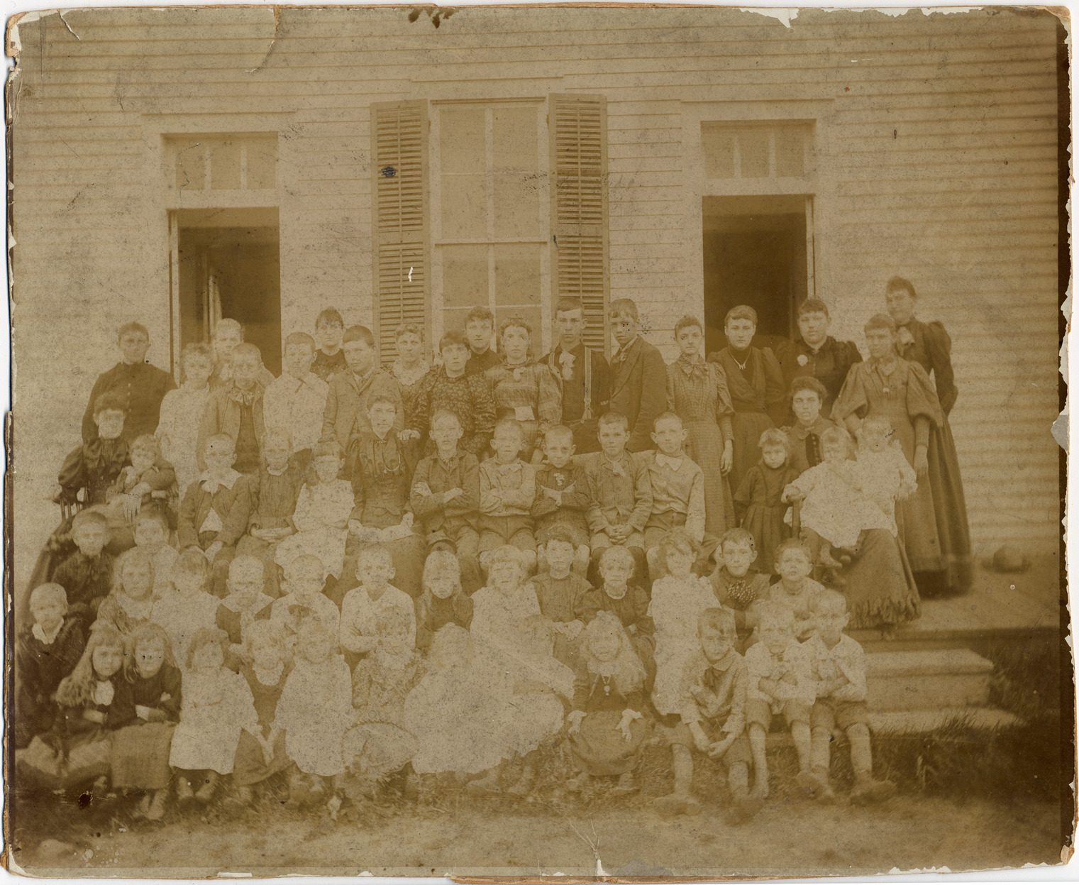 Favorite this☆ Teachers and students in front of school Description: Side of clapboard school building. Children sitting or standing on steps with adults behind. Handwritten on mat back: "Furgerson school, 1893, Deerfield Twp., Lapeer Co., collect 60 [cents]." Details Resource ID: DPA1382 Subject: School buildings--Michigan--Deerfield Students--Michigan--Deerfield Teachers--Michigan--Deerfield Portraits, Group--Michigan--Deerfield Albumen prints Photographic prints Date Issued: 1893 Format: 1 photographic print mounted on mat board ; image 8.25 x 10 in. Member of: Burton Historical Collection Filing Location: M/Schools Rights: Physical rights are retained by DPL. Copyright is retained in accordance with U.S. copyright laws.
