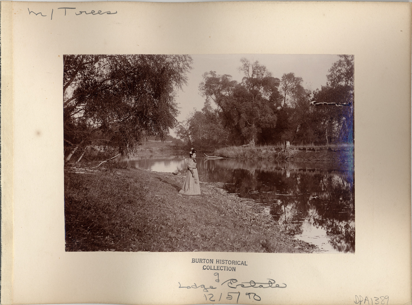 Favorite this☆ Garden with trees reflecting in water Description: Reflecting pond in parkland. Mixed deciduous trees. Woman in day dress in middle ground. Handwritten on mat front: "Lodge Estate." Mat warped. Details Resource ID: DPA1389 Subject: Gardens--Michigan Ponds--Michigan Lodge family--Homes and haunts--Michigan Albumen prints Photographic prints Date Issued: Unknown year Format: 1 photographic print on mat board ; image 4.75 x 6.75 in. Member of: Burton Historical Collection Filing Location: M/Trees Note (Content): DPA1390 on other side Rights: Physical rights are retained by DPL. Copyright is retained in accordance with U.S. copyright laws.