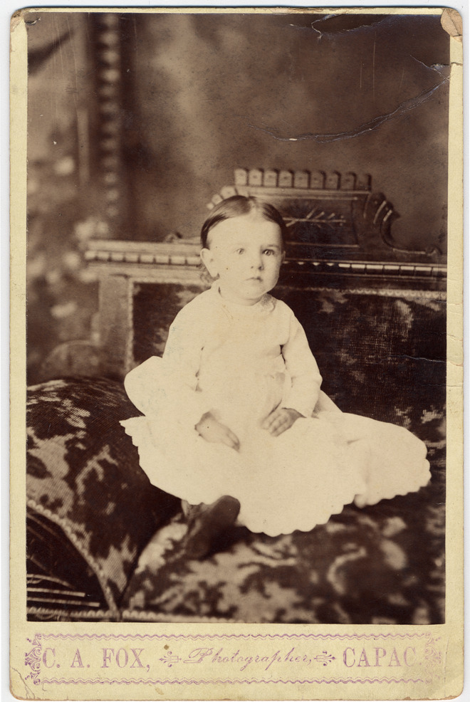 Favorite this☆ Portrait of a young child by C.A. Fox of Capac, Michigan Description: Portrait of a very young child wearing long dress, sitting on an upholstered piece of furniture. Printed on front of photo: "C.A. Fox, photographer, Capac." Details Resource ID: DPA1414 Creator: Fox, Charles A. Subject: Children--Michigan--Portraits Photographers--Michigan--Capac Cabinet photographs Photographic prints Date Issued: Unknown year Format: 1 photographic print mounted on mat board ; image 5 x 4 in. Member of: Burton Historical Collection Filing Location: M/Photographers-Capac Rights: Physical rights are retained by DPL. Copyright is retained in accordance with U.S. copyright laws.