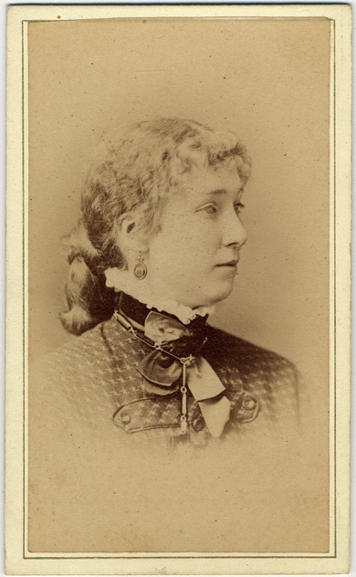 Portrait of a young woman wearing earrings, bow tied at neck of high lace collar and a necklace; hair is pulled back into a braided chignon with bangs. Printed on photo back: "W.C. Foote, photographer, Covert Block, Flint, Mich., duplicates can be had at any time."