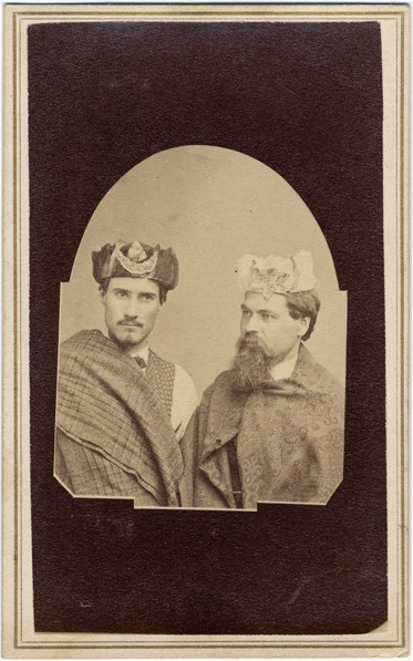 Portrait of two men wearing blankets or shawls over their clothes and makeshift crowns. Printed on photo back: "J.H. Phipps, photographer, Fenton, Mich. duplicates can be had."
