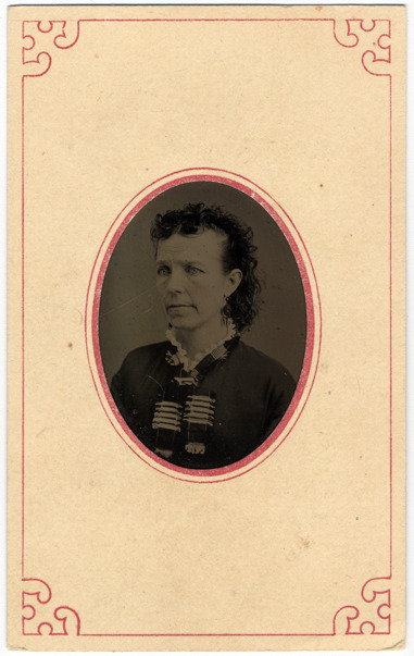 Portrait of a woman with earrings, curly hair pulled back and worn down with curly bangs in the front, wearing a lace collar with a decorative scarf. Mounted in cardboard cutout frame. Printed on photo back: "E. Bissell photograph, artist, Saginaw St, Holly, Mich. All kinds of picture frames for sale."
