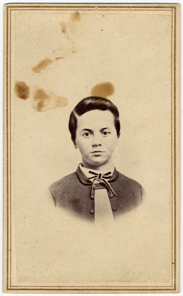 Portrait of a young boy with hair parted to the side and back, wearing a suit jacket, dress shirt and striped bow tie. Printed on photo back: "J.V. Cookingham, artist, Jackson, Mich."