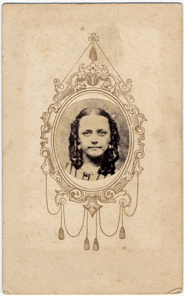 Vignette of the face of a young girl with hair parted down the middle and pulled back in two curly ponytails. A frame printed in gold surrounds portrait. Printed on photo back: "Photographed by A.M. Cheney, Lansing, Mich. Rooms over the City Book Store."