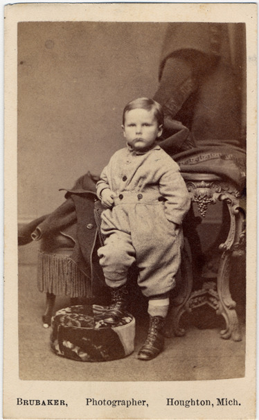 Portrait of a young boy standing, leaning against a photographers chair, one foot on an ottoman, hand in pocket, hair is parted on the side and smoothed down, wearing a light-colored one piece outfit and dark colored boots with laces. Printed on photo front: "Brubaker, Houghtin, Mich." Printed on photo back: "C.B. Brubaker, photograhper, over Washburn's Jewelry Store, Houghton, Mich. Special attention given to enlargements and copying of all kinds, in ink and in colors. Negatives preserved for further orders."