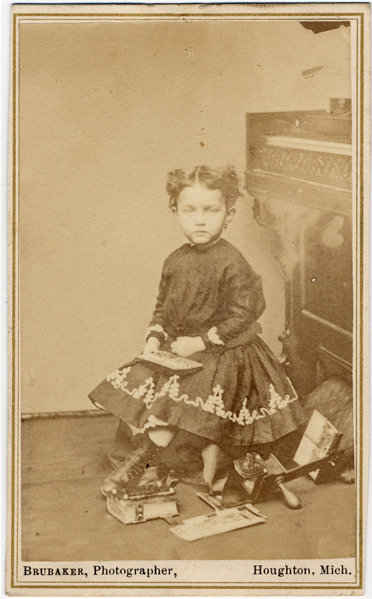 Portrait of a young girl with earrings sitting next to a parlor organ holding a stereocard in one hand, hair is curly, parted down the middle and pulled up into two small ponytails, wearing a dark dress with white trim around the cuffs and skirt bottom, and boots with buckles on the side. She is surrounded by a stereoopticon viewer, stereocards and a photo album. Printed on photo front: "Brubaker, Photographer, Houghton, Mich." Printed on photo back: "C.B. Brubaker, photographer, over Washburn's Jewelry Store, Houghton, Mich. Negatives preserved for further orders."